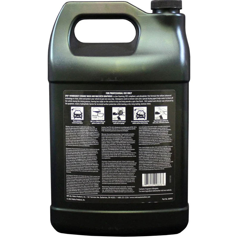 EPIC® Hydrosheet™+ Ceramic Wash & Wax with Graphene is a low-foaming graphene car wash & wax that utilizes advanced cleaning agents to remove grime, soils, and contaminants while unique drying agents allow water to sheet off the vehicle during the rinsing process and provide a water spot free finish. SiO2 sealant and silicone wax, enhanced by graphene, create a hydrophobic barrier for increased surface protection while leaving a rich, long-lasting, lustrous shine. Dilutes 1:20